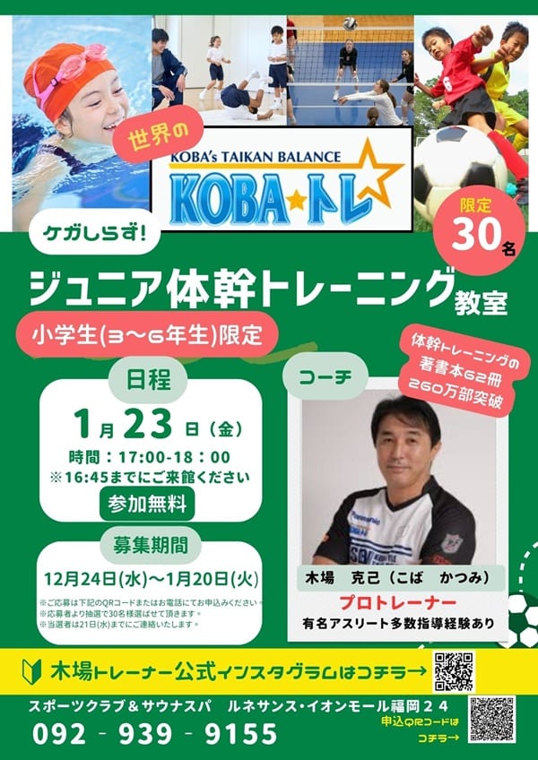 有名アスリートを多数指導されている、プロトレーナーの「木場克己さん」をお呼びして、ケガをしないカラダつくり、パフォーマンス向上のための『体幹トレーニング教室』を開催致します。