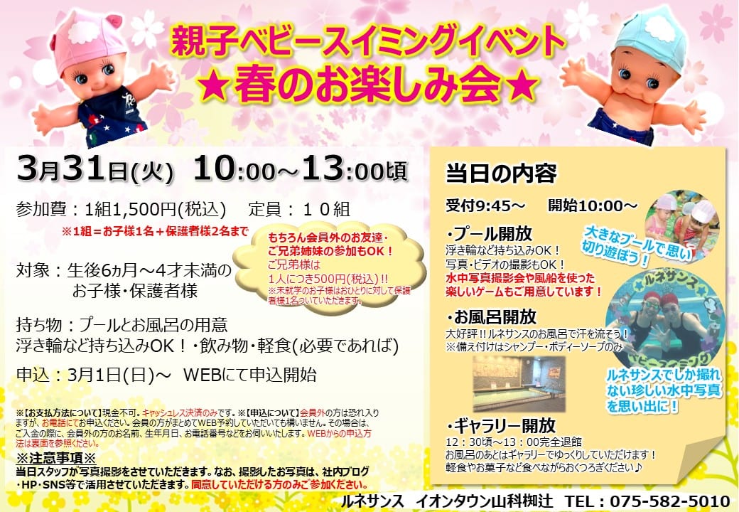 今回は親子ベビースイミング、春のお楽しみ会のお知らせです!(^^)!