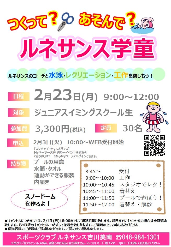 こんにちは! スイミングの三輪です! 今回は2月23日(月・祝)に開催する 「ルネサンス学童」のご案内です☆ >>>拡大して表示する<<< &nbs・・・・