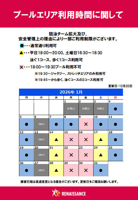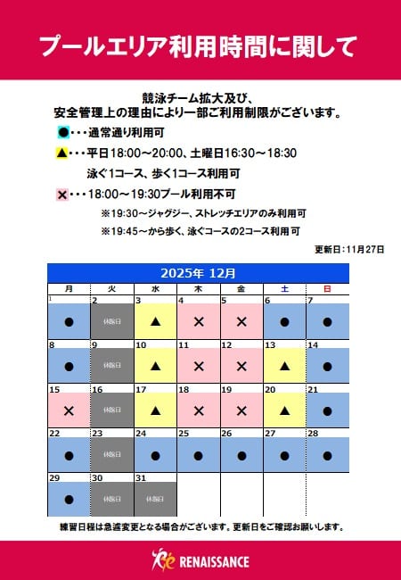 12月プール利用可能時間