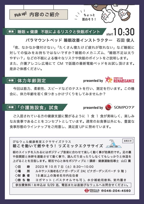 近日開催される「びなウェル健康教室」や「体力測定」など、ルネサンスが担当させていただきます。