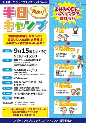 ルネサンス福岡香椎のスタッフブログをご覧いただきありがとうございます♪ 今回はジュニア向けイベントのお知らせです。 9月15日(月・祝)は、ルネサンス福岡香椎で「半日預かりキャンプ・・・・