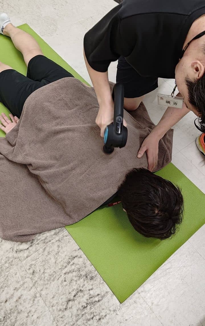 高性能な振動ガン「セラガン」で心地よい力とリズムで“叩く”ことで筋肉をゆるめ、トレーナーがほぐれた筋肉をやさしく伸ばす、ペアセッション。