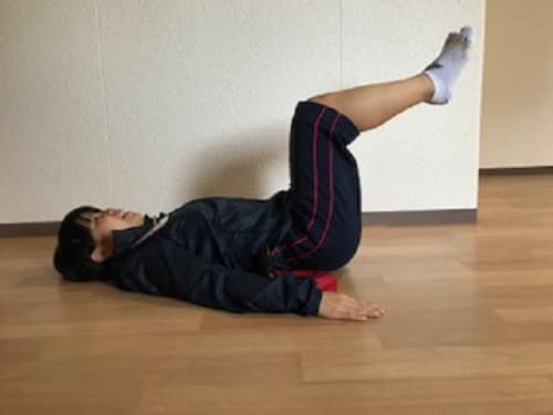 ・床の上、仰向けでお膝をくっ付け90度になる様に持ち上げます。