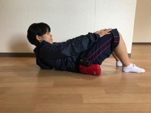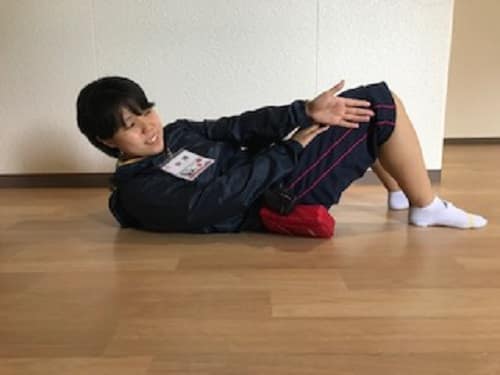 ・手が腿に外側につくように、片方の肩甲骨を浮かせるくらいで持ち上げます。