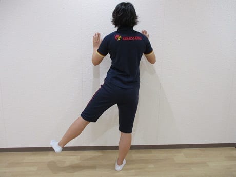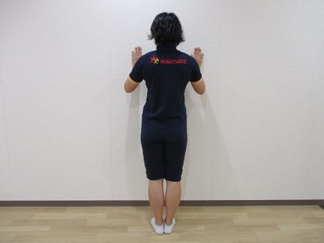 ①両手を壁に添え、両足を閉じて立ちます。