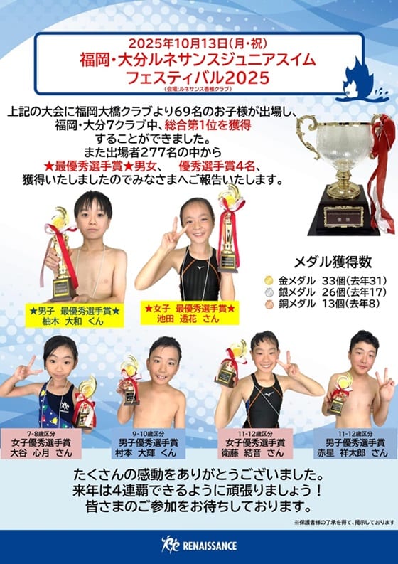 ★10月13日(月・祝)ジュニアスイミングフェスティバル 大橋優勝★