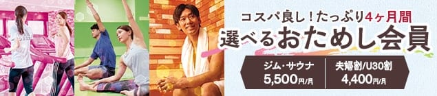 【新規の方・30歳以下限定/最長4ヶ月】 全営業時間、ジム・スタジオ・ロッカールームと付帯の温浴施設が使い放題! ※プールエリアは利用不可。 |