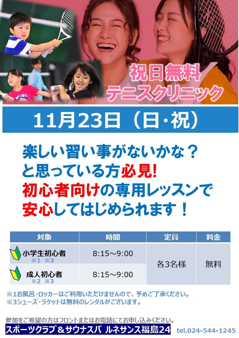 11月 祝日無料テニスクリニック(ジュニア・はじめて・少人数)・・・NEW!