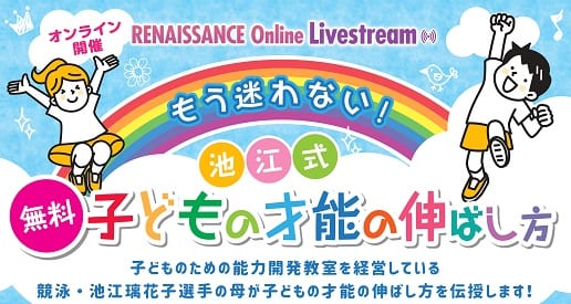 皆様こんばんは!フィットネスチーフの二畑です。本日もまたまたオンラインイベントのご案内です♪ \ルネサンスオンラインライブストリーム限定「【池江式】もう迷わない!子どもの才能の伸ばし・・・・