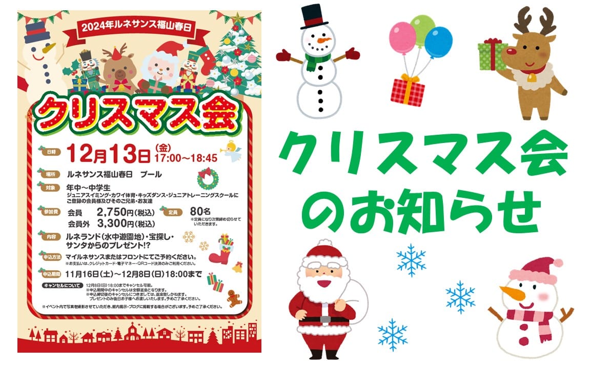 みなさま、こんにちは! スイミングの芳田です! さて、今回は!! クリスマス会!のお知らせです! 去年も行いましたが、80名以上のたくさんのお友達が参加してくれ・・・・