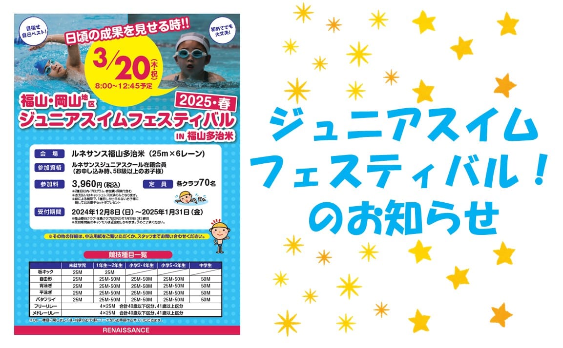皆さま、こんにちは! スイミングの芳田です! さて今回は、前回のブログでちょこっとお伝えした、ジュニアスイムフェスティバルについてのお知らせです! ・・・・