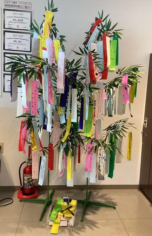ジュニアスイミング生のこどもたちがお願いごとを書いた短冊を飾ります。