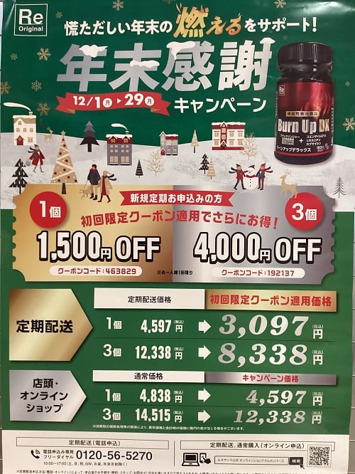 そんなバーンアップDXが、12/29(月)までの期間中、1個5%OFF、3個15%OFFでご購入いただけます!