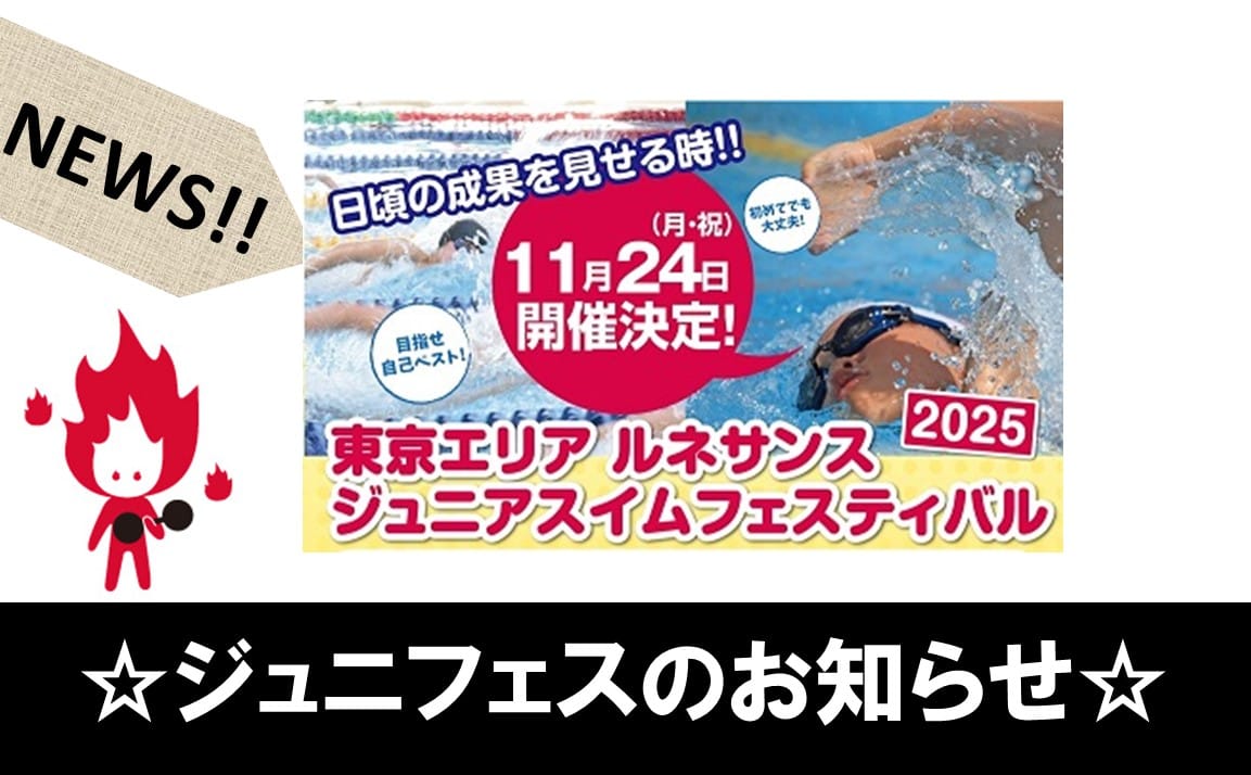 こんにちは! フィットネススタッフの大西です(*^-^*) 今年も11月24日(月・祝)にジュニアスイムフェスティバル参加に沢山のご予約ありがとうございます! ※@東久留米クラブ・・・・