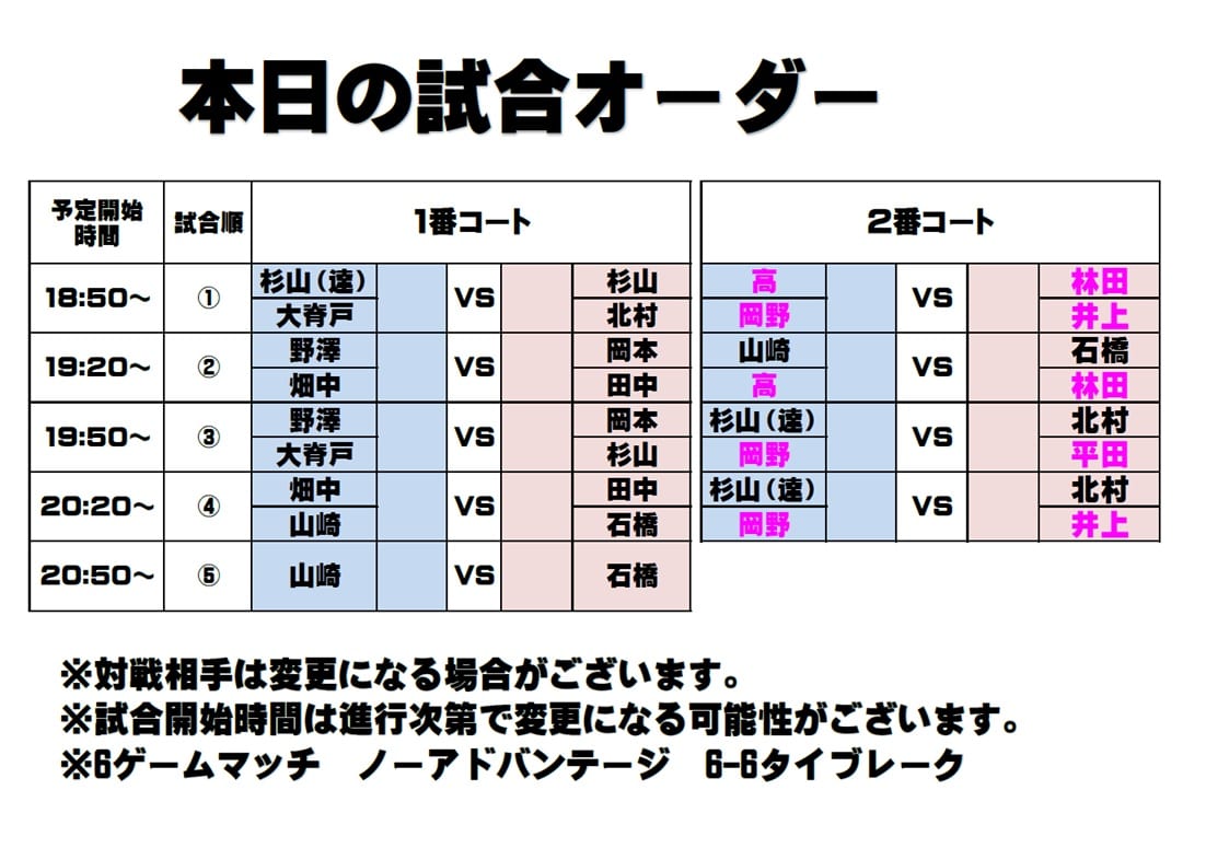 それぞれのチームからダブルスペア・シングルスを