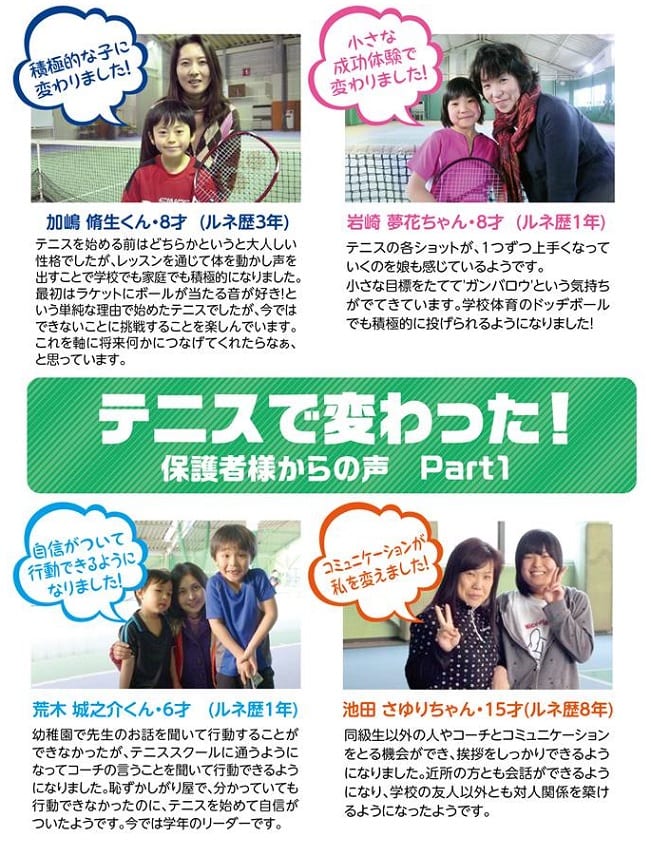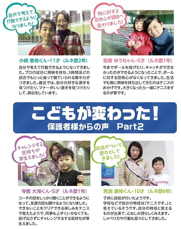 テニス上達のカギは、正しいフォームを安定的に身につけること。 レッスン中に撮影した動画をその場で確認し、一人ひとりに応じた的確なフォーム修正を行うことで、従来よりも格段に効率よく上達することができます。撮影したデータはその場で確認できるので自分ではわかりにくいフォームのクセも、すぐに把握することができます。コーチと一緒に、その次のプレーから改善を意識した練習が可能になります。