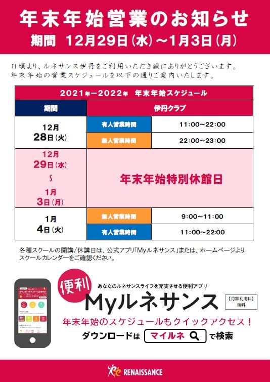 こんにちは。フィットネスの原田です。 年末年始営業スケジュールのお知らせです。 このブログが、今年最後のブログとなります。 &nb・・・・