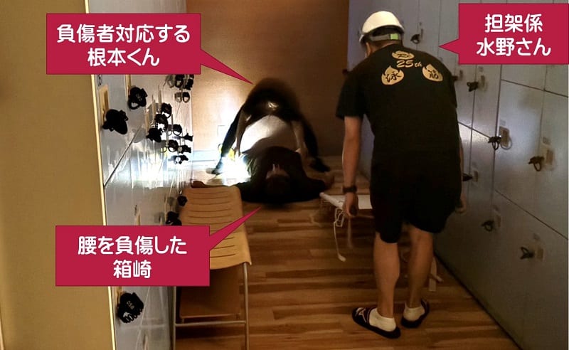 避難訓練前日にぎっくり腰なってしまった私は、担架で搬送される係になりました。
