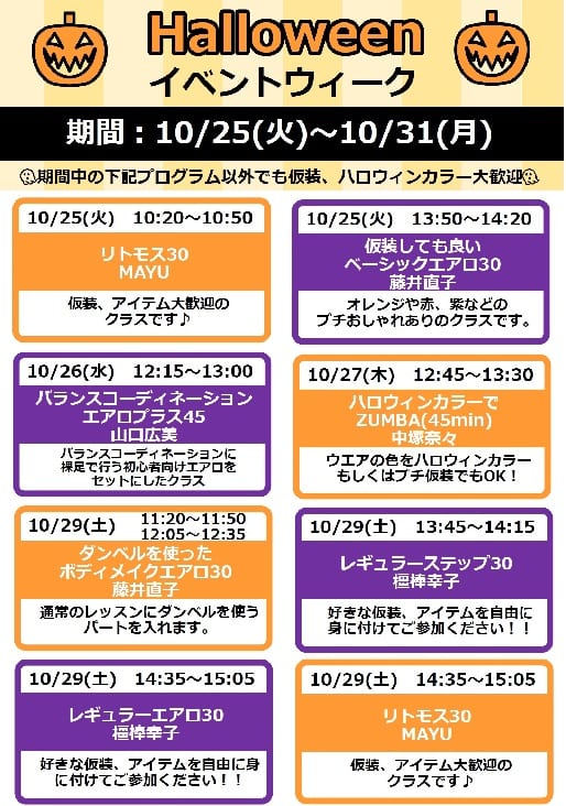 期間中(10/25~10/31) は上記以外のクラスでも仮装・ハロウィンカラー大歓迎です(^O^)