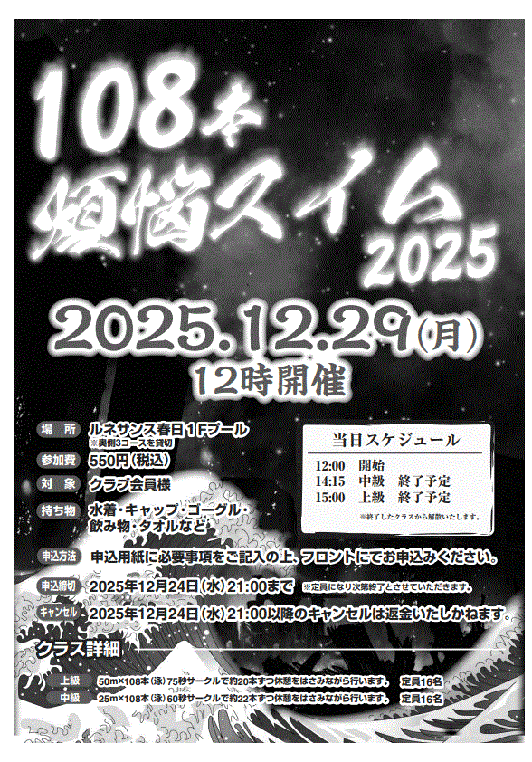 こんにちは!スイミングの城戸です。 いつもルネサンス春日のスタッフブログをご覧いただきありがとうございます。 朝晩が寒くなり、11月になったと思ったら 12月が始・・・・