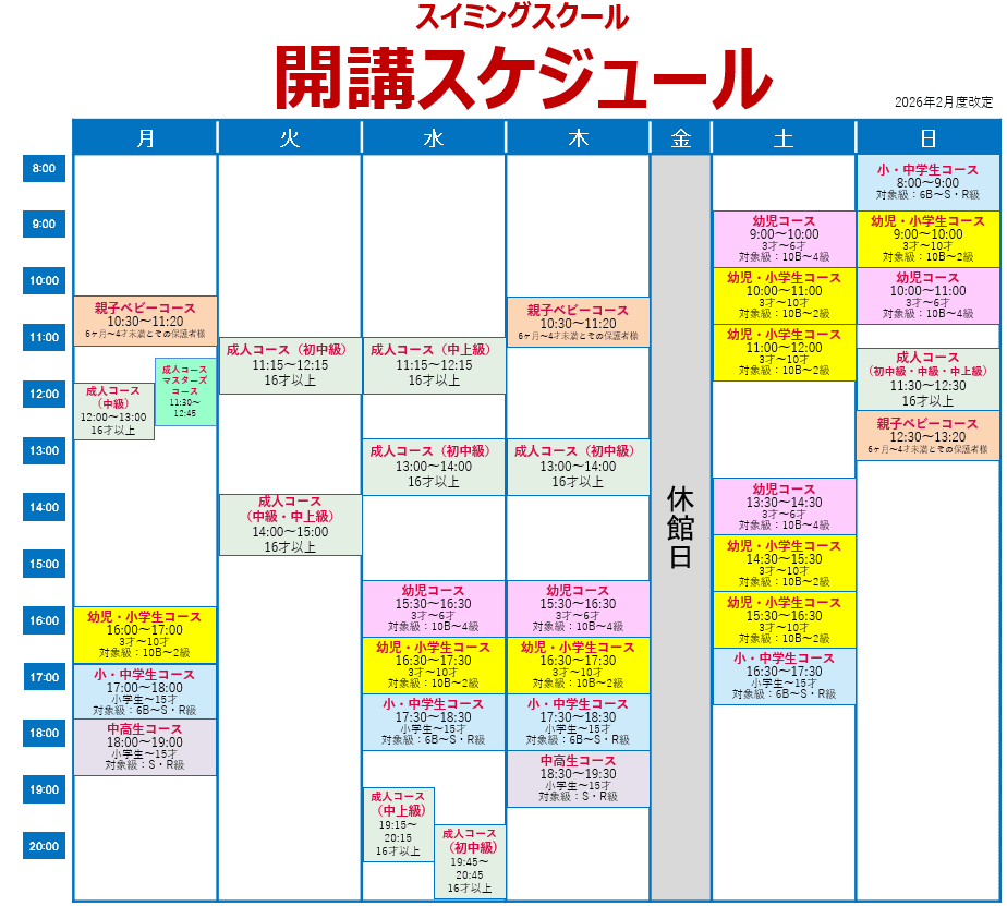 L水慣れ・もぐり・けのび・バタ足・クロール・背泳ぎ・平泳ぎ・バタフライ
