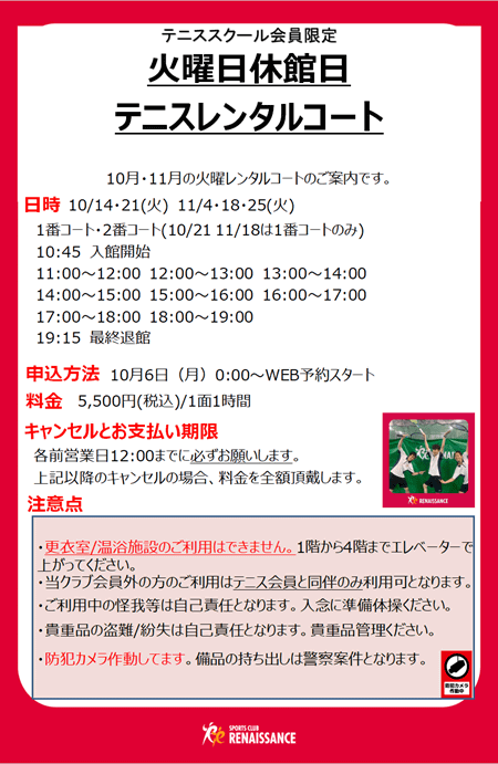 今回のブログでは、休館日(火)にレンタルコートがご利用できるようになったので、ご案内をします!