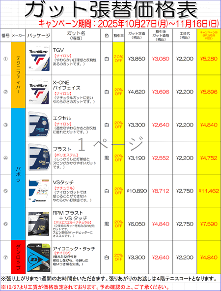 今回のガットキャンペーンから、ガットの工賃代が価格改定しています。
