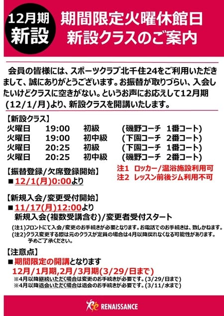 《テニス》火曜休館日 期間限定新設クラスのご案内
