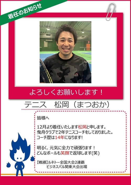 《テニス》新しいコーチが北千住に来ます!