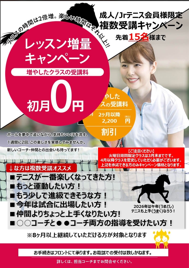 ≪テニス≫重複受講キャンペーンはじまるよ~!!!もっとテニス「うま」くなろう!!!
