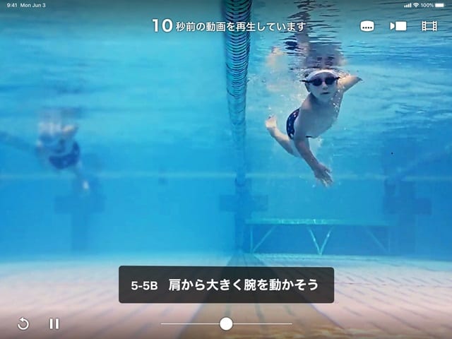 プールサイドにて自分の泳ぎをタブレットで確認し、セルフフィードバックを行う |