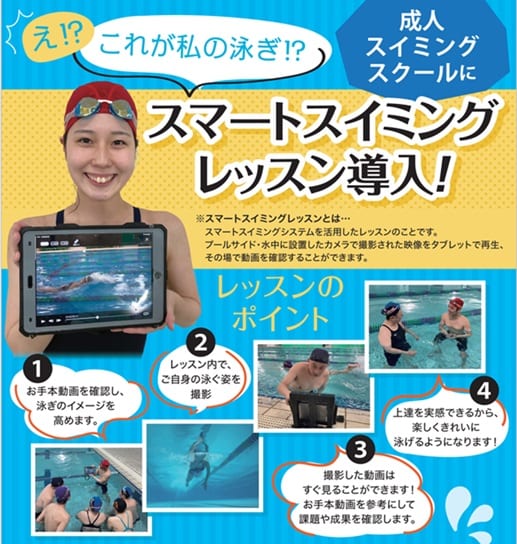 スマートスイミングシステムを活用したレッスンのことです。プールサイド・水中に設置したカメラで撮影された映像をタブレットで再生、その場で動画を確認することができます!