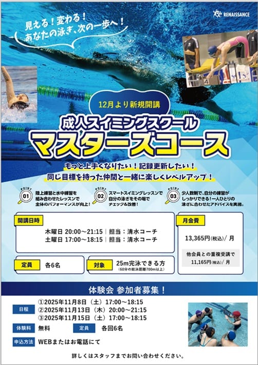 マスターズスクール:13,365円(税込)/月4回 75分レッスン(陸上練習15分+水中練習60分)