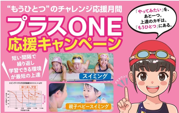 プラスONE応援キャンペーン 今なら気軽に「もうひとつ」チャレンジできるチャンス! ・週1回のスイミングを週2回にしてグングン上達! ・親子ベビーを週2回にして、親子の絆UP・・・・