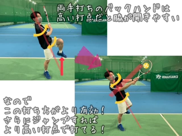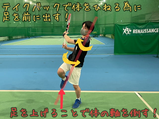 肩より高い打点で打ちたい場合は写真のように片足上げて捻って準備!