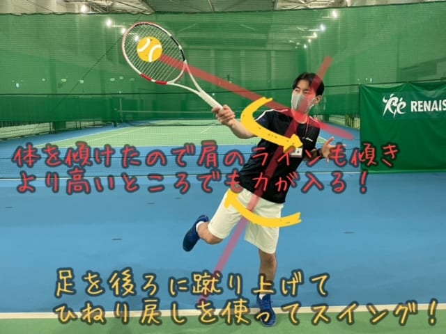 片足上がってるので地面を踏ん張れないので身体の捻り戻しを使ってパワーをだす!