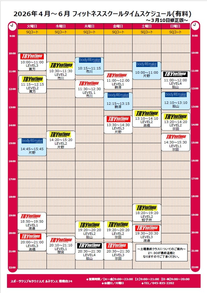 月 火 水 木 金 土 日 ボディリメイク 休館日 14:45~15:45 10:15~11:15 12:15~13:15 10:00~11:00 12:10~13:10