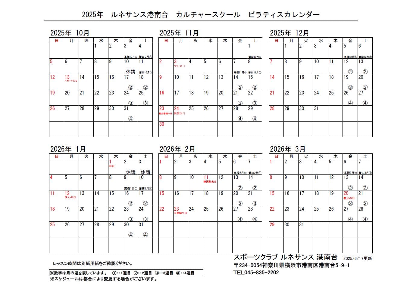 月 火 水 木 金 土 日 ピラティススクール(月4回) 13:30~14:30 10:40~11:40 18:30~19:30