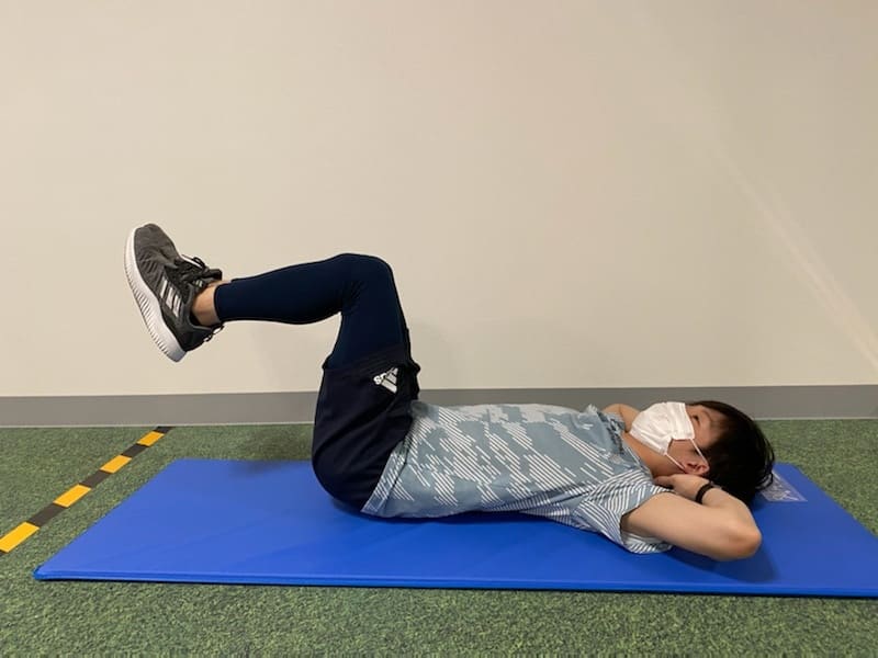 ①仰向けになり手は頭の後ろ、股関節・膝を90度に曲げます