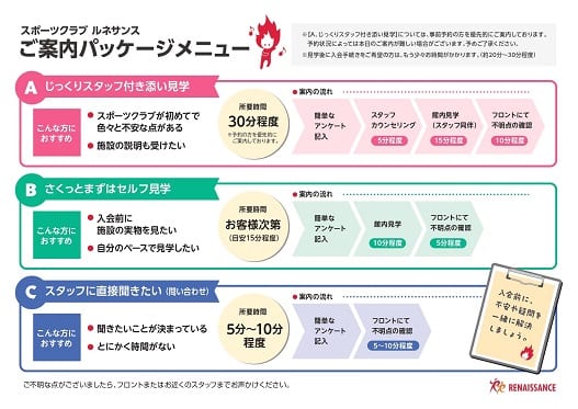 ここではスタッフが付いてのご案内についてお話しましたが、1人で見学したい!ホームページである程度施設や情報は知っているから契約プランや初期費用について聞きたい!という方にピッタリなご案内メニューもございます(^^)/