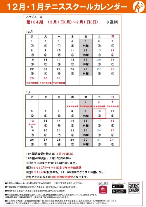 【1月】テニススクール掲示板『スクールカレンダー』『イベント情報』『欠席・振替登録』などのご案内