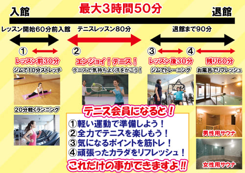 【成人テニス体験情報】サウナ・お風呂入り放題が登場!テニスがはじめての方でも始めやすい「はじめてクラス」もあります!室内コート、暖房完備で快適テニス!