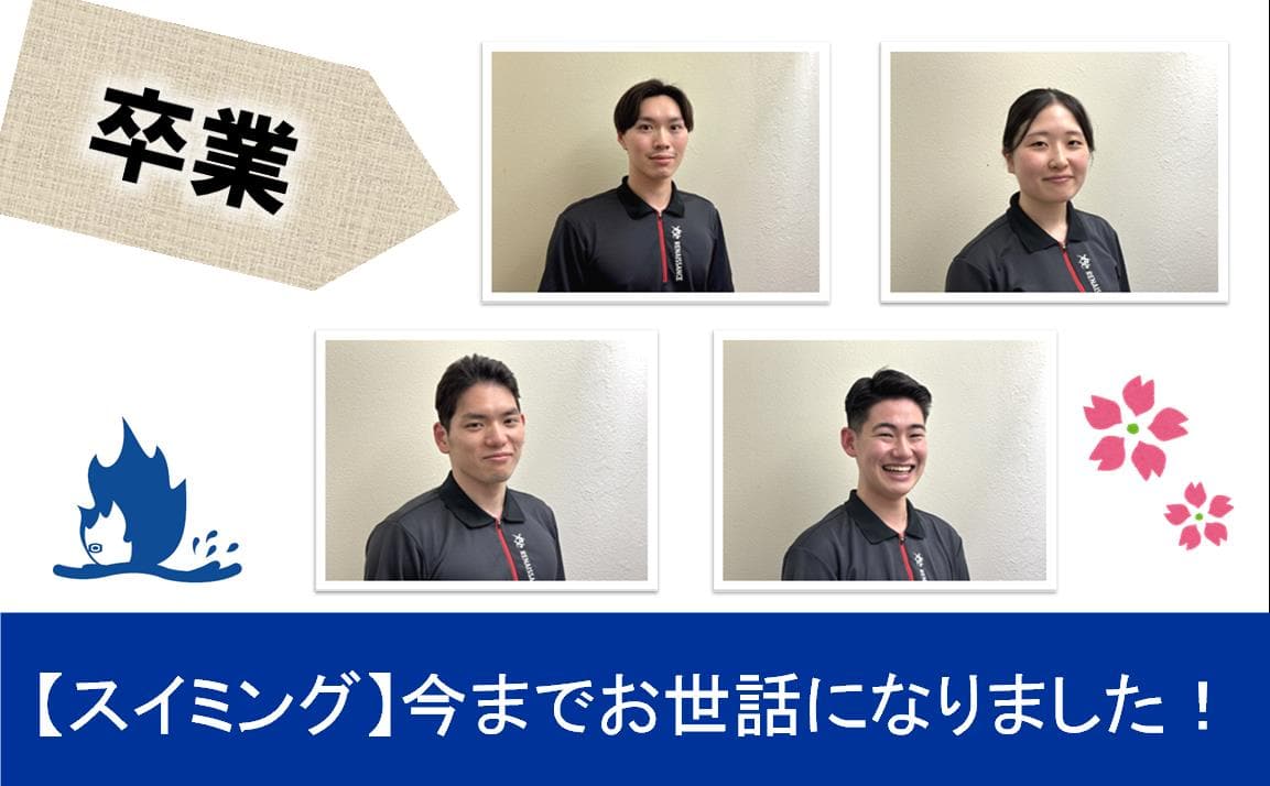 こんにちは! スイミングスタッフの小樋です! 3月、卒業シーズンですね、、、 スイミングセクションからは、4名のコーチが卒業します(´;ω;`) 経堂ク・・・・