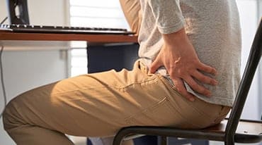 正しい姿勢をとっていても、腰の骨は負担がかかりやすいもの。立っているときは体重と同程度の負荷がかかりますが、実はさらに負担が大きいのが、デスクワークなどで「前かがみになって椅子に座った状態」です。体の重心が前方に移動することで、腰により強い圧力がかかってしまうためです。長時間のデスクワークが腰痛を引き起こしやすいのは、まさにこの負荷のかかる姿勢をとり続けてしまうことが原因といえます。