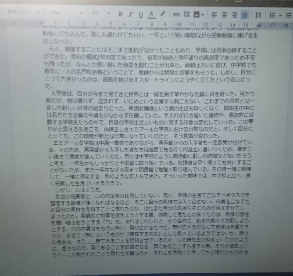 小さなころからよく空想をしていて、大学に入ってからその話を文章で表現しています!完成すると300ページ以上になり、現在90ページまで書いてます。