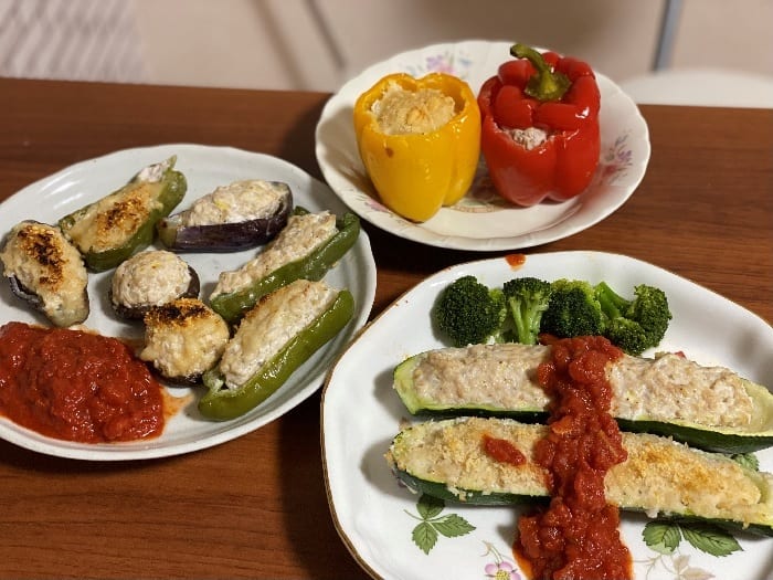 ズッキーニ・ピーマン・椎茸・パプリカ・ナスの肉詰めを作りました。