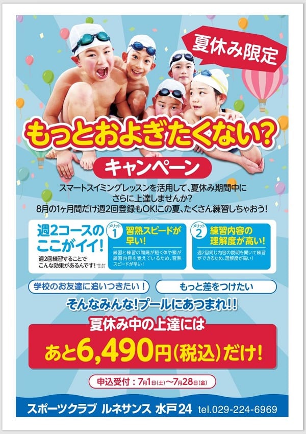 申込は7月1日(土)からです。ルネサンス水戸のホームページの「入会予約」から「ジュニアスイミング」を選択し、