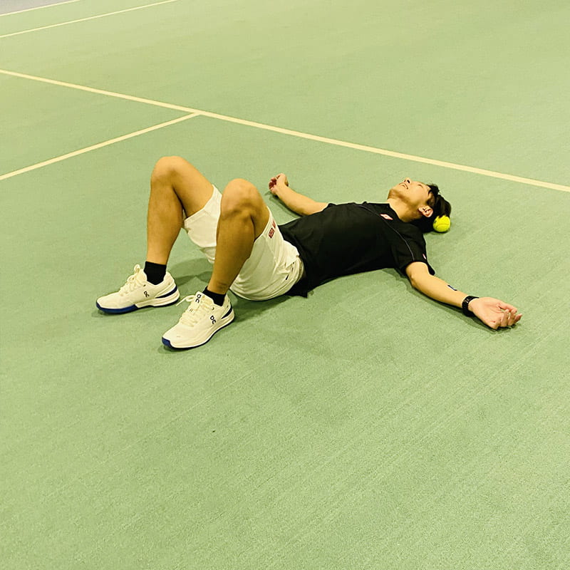 まずは飲む前…江藤コーチに協力して貰って、10分間ひたすらボールを追いかけて打っていきます!