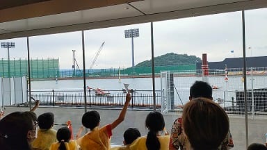 応援するボートの色の旗を振りながら、大人も子供も大興奮です!!\(^o^)/